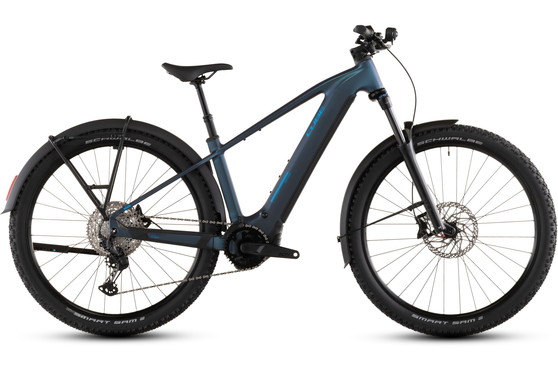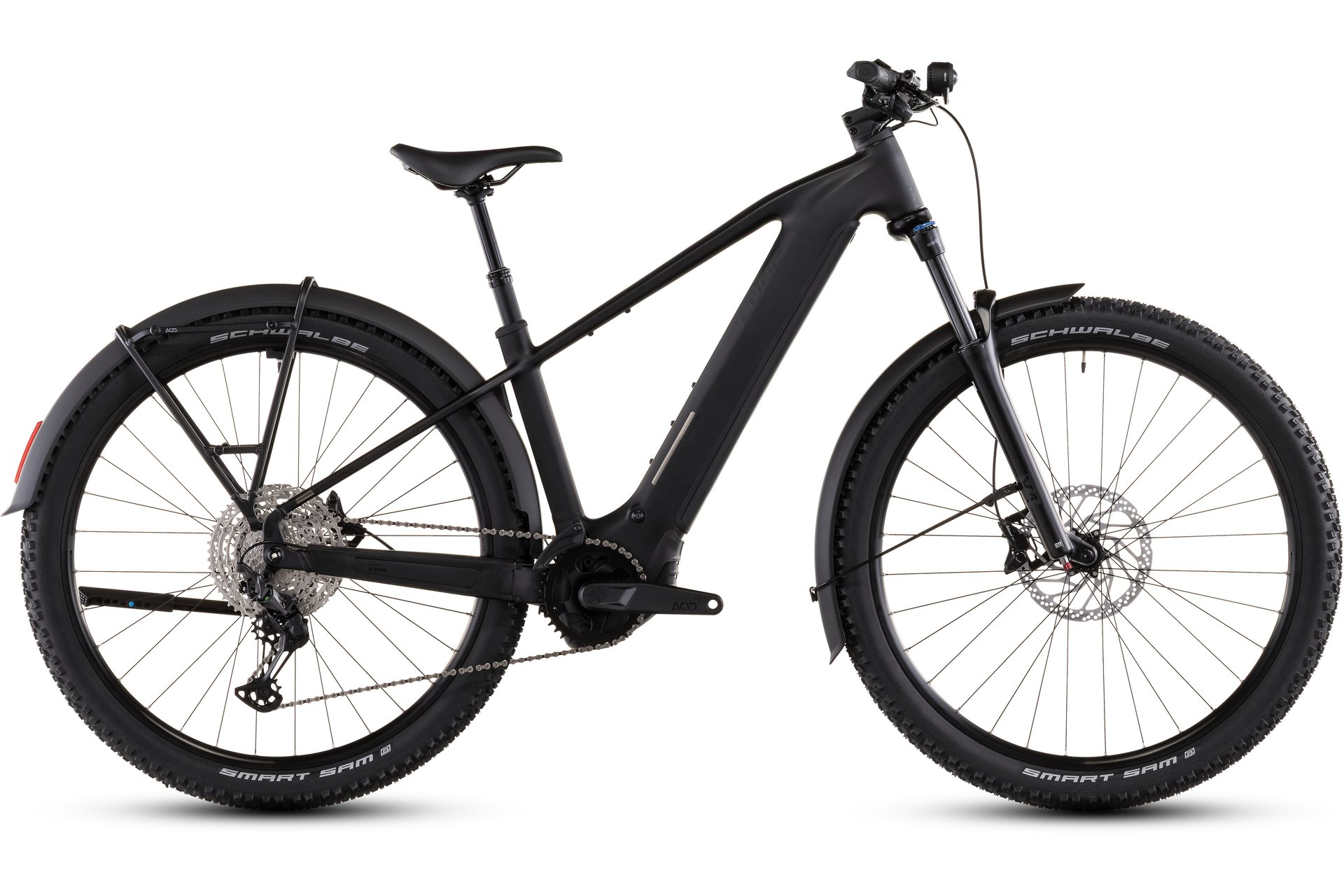 Die Luftfedergabel SR Suntour X1-32 LO-R mit 120 mm Federweg und Tapered-Schaft unterstützt das Fahrverhalten auf unebenen Strecken und verbessert den Komfort. Die integrierte CUBE Dropper Post mit Lenkerfernbedienung erlaubt eine flexible Anpassung der Sitzhöhe während der Fahrt, was die Kontrolle und den Komfort zusätzlich erhöht. Der Sattel ACID Sequence 160 und der CUBE Rise Trail Bar 35 Lenker runden den Komfort ab und sind auf sportliche Ansprüche abgestimmt.