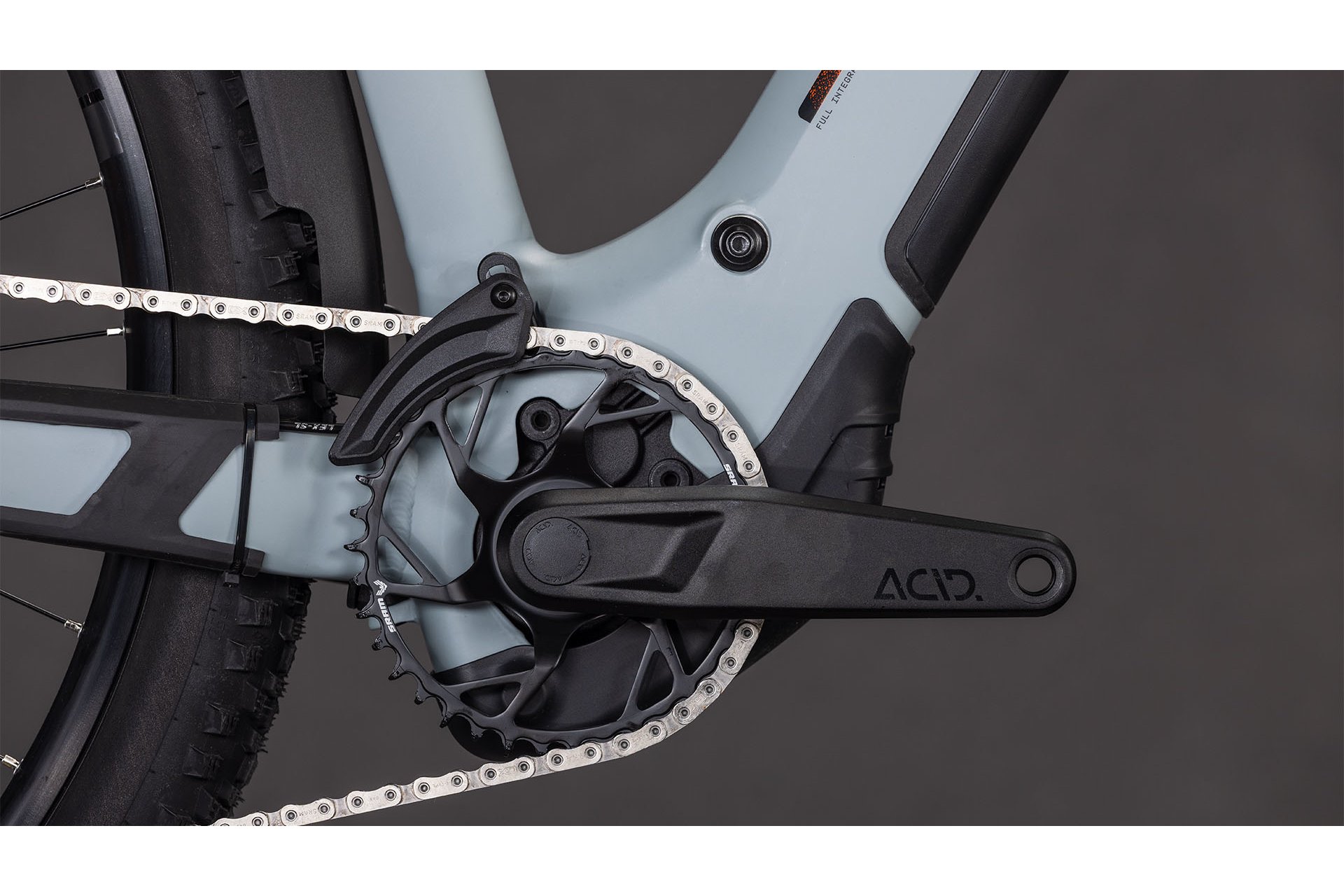 Das Bike ist mit einer 12-Gang-Kettenschaltung von Sram ausgestattet, genauer mit der GX Eagle Transmission. Das Schaltwerk und der Schalthebel stammen ebenfalls aus der Eagle 90 Serie von Sram. Diese Kombination bietet eine präzise und zuverlässige Schaltperformance, die in Verbindung mit der Kurbelgarnitur ACID MTB Hybrid Pro mit 38 Zähnen eine gute Bandbreite an Übersetzungen bereitstellt. Der Bosch Performance Line CX Smart Gen5 Mittelmotor unterstützt den Fahrer bis 250 Watt und ist mit dem Bosch Purion 200 Display ausgestattet, das eine übersichtliche Darstellung der Fahrdaten ermöglicht. Der Akku vom Typ Bosch PowerTube 800 bietet eine Kapazität von 800 Wh, was eine ausreichende Reichweite für längere Fahrten gewährleistet.